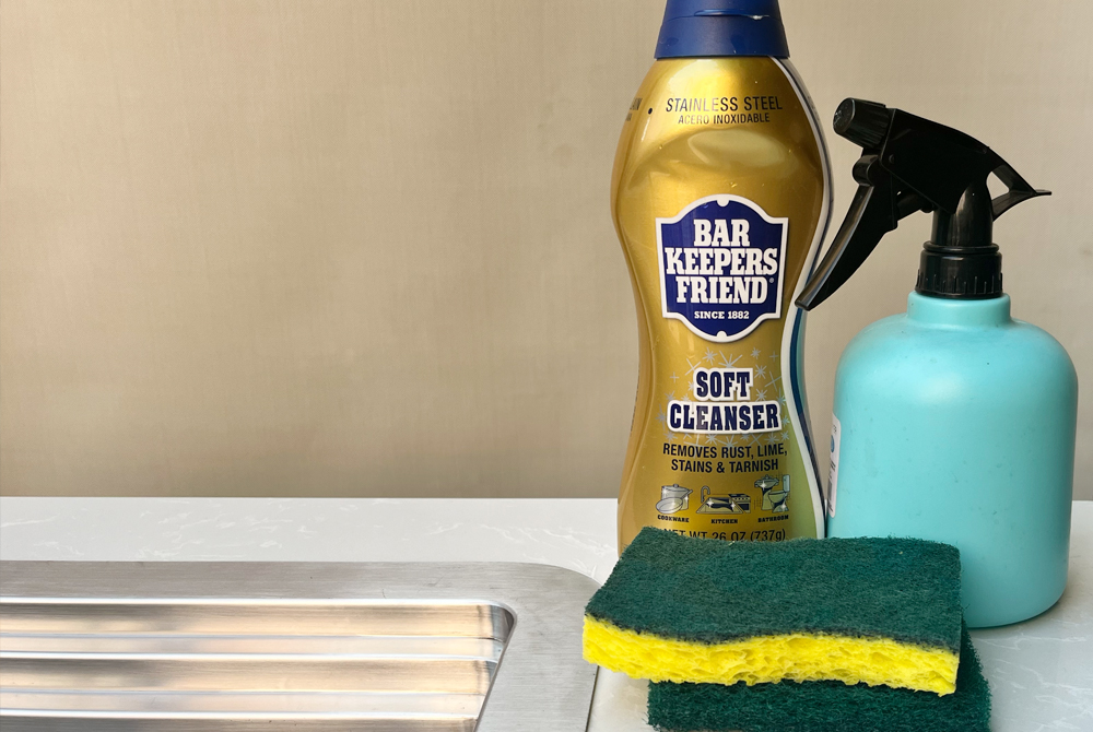 Initially, you should rinse the sink to remove any loose debris or food particles. Ensure that you also rinse the faucet and the immediate area around the sink.